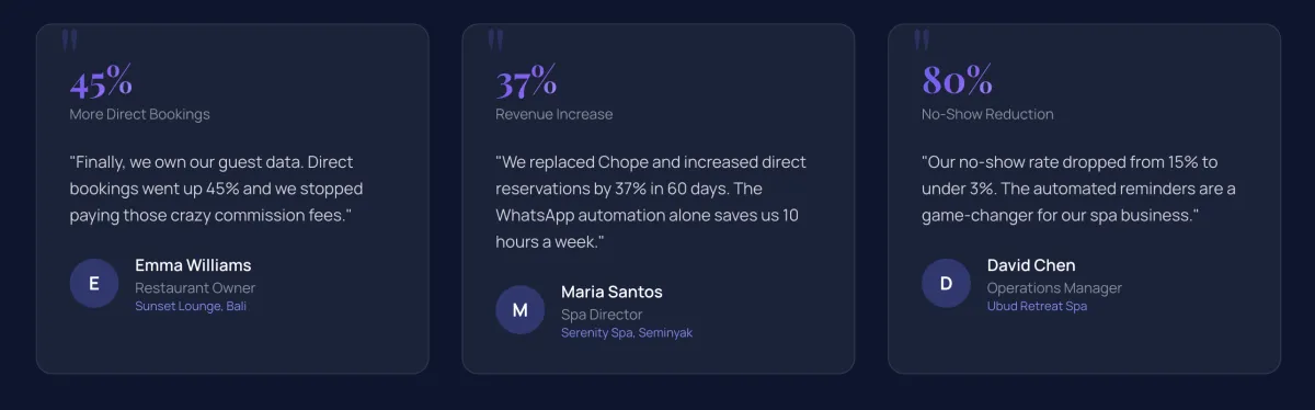 FlowHub is designed for restaurants, boutique hotels, spas & wellness centers, premium salons, and experience-based businesses in Bali and Southeast Asia.